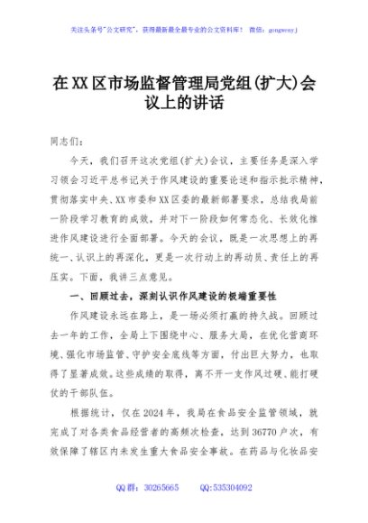 / 在XX区市场监督管理局党组(扩大)会议上的讲话