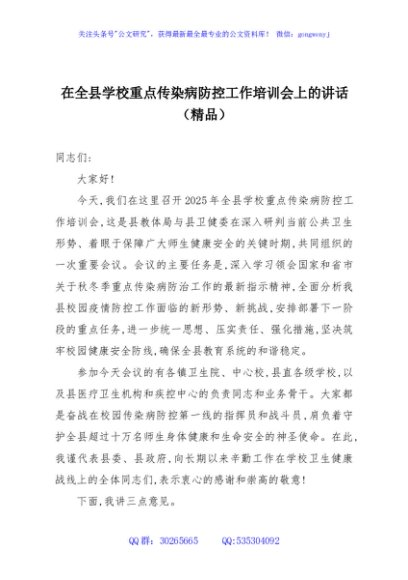 / 在全县学校重点传染病防控工作培训会上的讲话(精品)