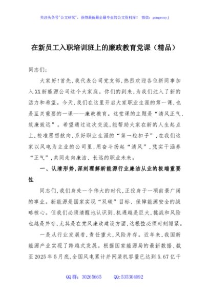 / 在新员工入职培训班上的廉政教育党课(精品)