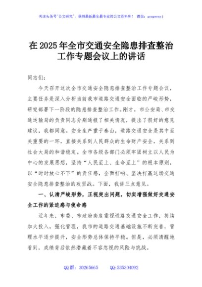 / 在2025年全市交通安全隐患排查整治工作专题会议上的讲话