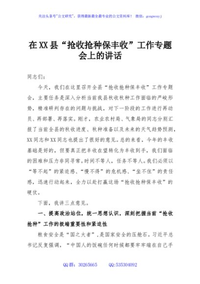 / 在XX县“抢收抢种保丰收”工作专题会上的讲话