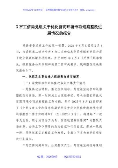 / X市工信局党组关于优化营商环境专项巡察整改进展情况的报告