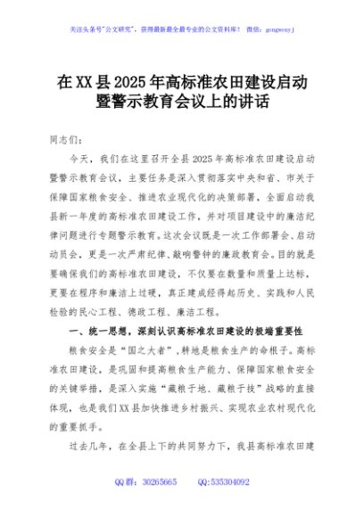/ 在XX县2025年高标准农田建设启动暨警示教育会议上的讲话