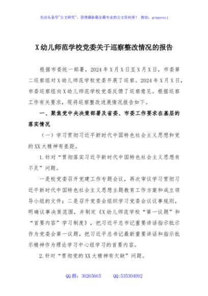 / X幼儿师范学校党委关于巡察整改情况的报告