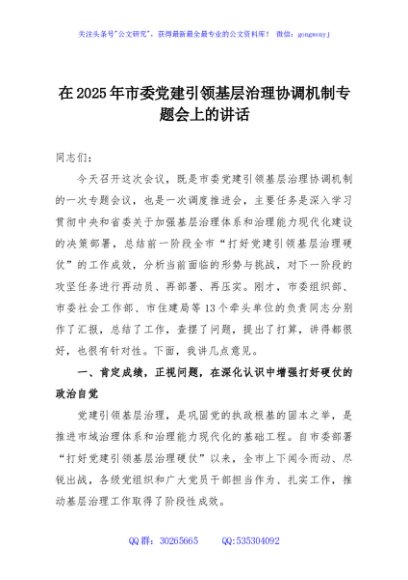 / 在2025年市委党建引领基层治理协调机制专题会上的讲话