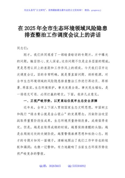 / 在2025年全市生态环境领域风险隐患排查整治工作调度会议上的讲话