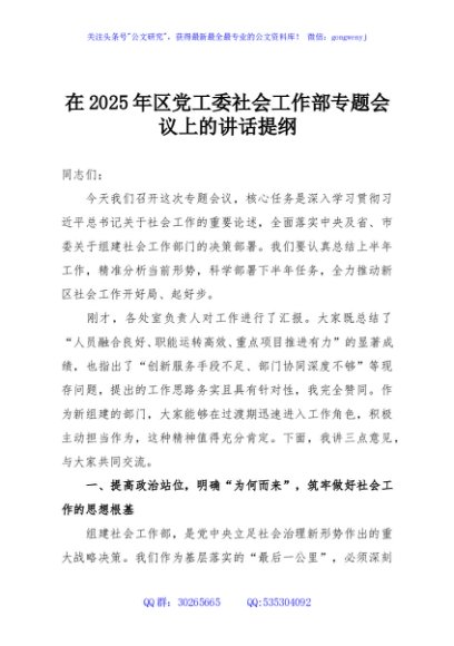 / 在2025年区党工委社会工作部专题会议上的讲话提纲