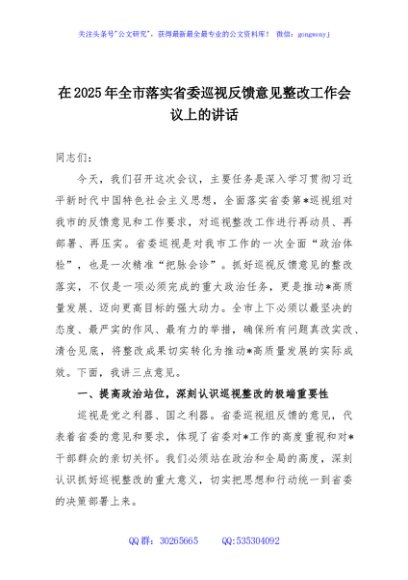 / 在2025年全市落实省委巡视反馈意见整改工作会议上的讲话