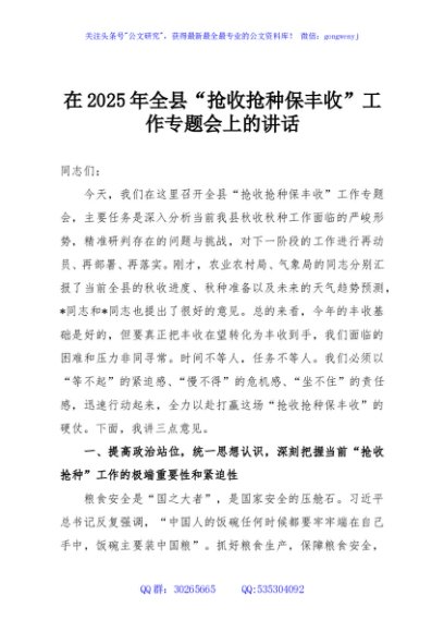 / 在2025年全县“抢收抢种保丰收”工作专题会上的讲话