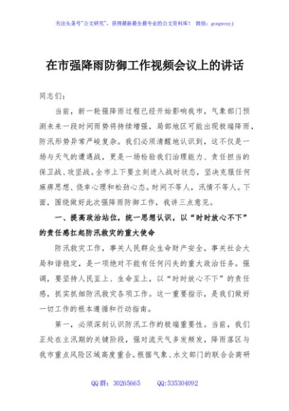 / 在市强降雨防御工作视频会议上的讲话