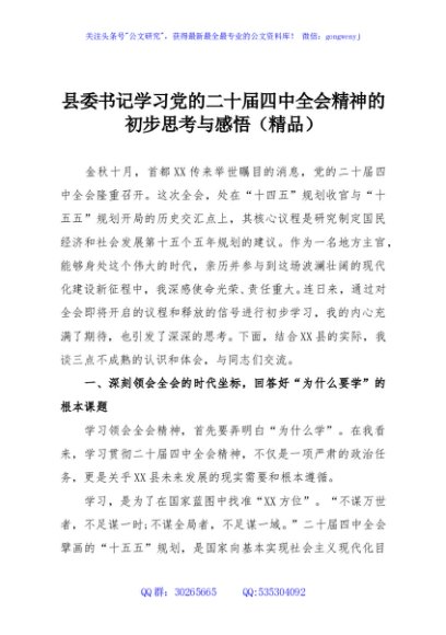 / 县委书记学习党的二十届四中全会精神的初步思考与感悟(精品)