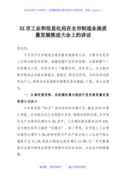 / XX市工业和信息化局在全市制造业高质量发展推进大会上的讲话