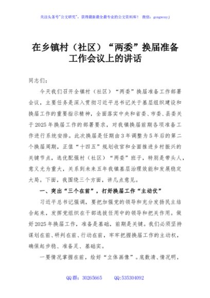 / 在乡镇村(社区)“两委”换届准备工作会议上的讲话