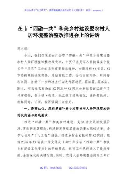 / 在市“四融一共”和美乡村建设暨农村人居环境整治整改推进会上的讲话