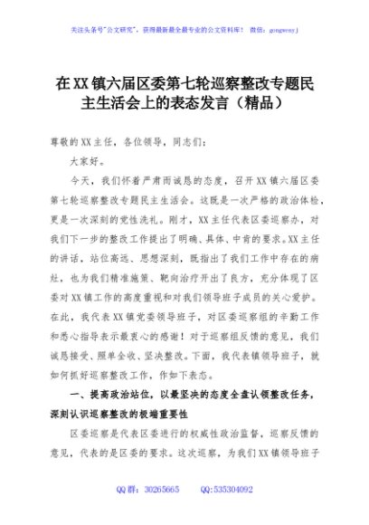 / 在XX镇六届区委第七轮巡察整改专题民主生活会上的表态发言(精品)