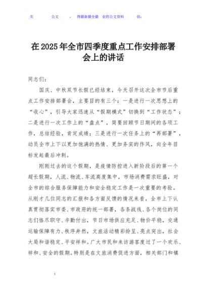/ 在2025年全市四季度重点工作安排部署会上的讲话