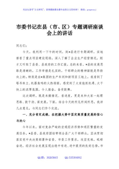/ 市委书记在县(市、区)专题调研座谈会上的讲话