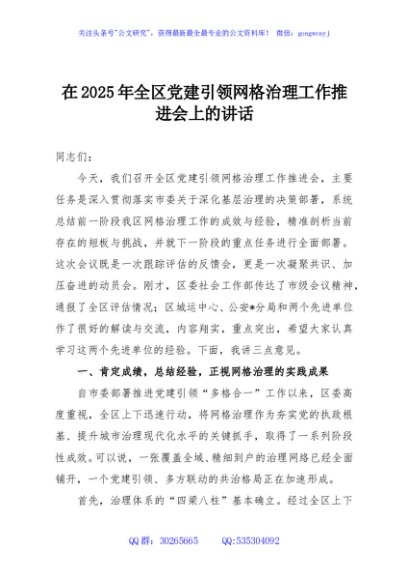 / 在2025年全区党建引领网格治理工作推进会上的讲话