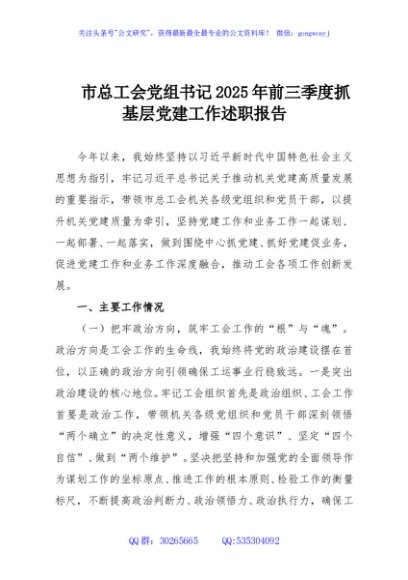 / 市总工会党组书记2025年前三季度抓基层党建工作述职报告