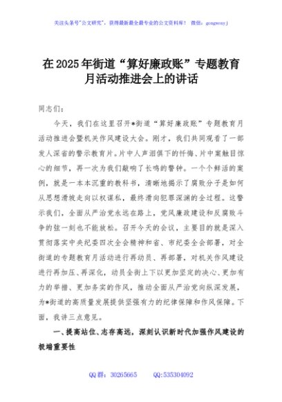 / 在2025年街道“算好廉政账”专题教育月活动推进会上的讲话