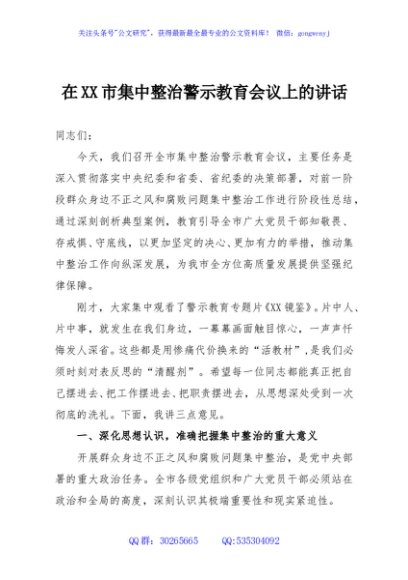 / 在XX市集中整治警示教育会议上的讲话