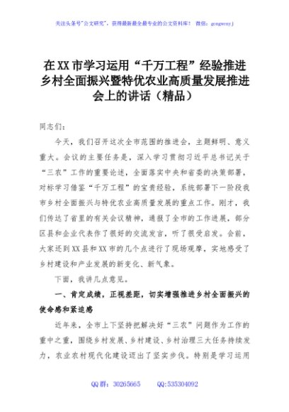 / 在XX市学习运用“千万工程”经验推进乡村全面振兴暨特优农业高质量发展推进会上的讲话(精品)
