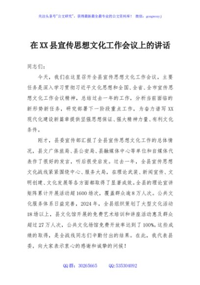 / 在XX县宣传思想文化工作会议上的讲话