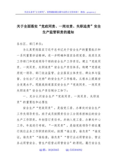 / 全面落实“党政同责、一岗双责、失职追责”安全生产监管职责的通知(含乡镇安全生产工作责任清单)