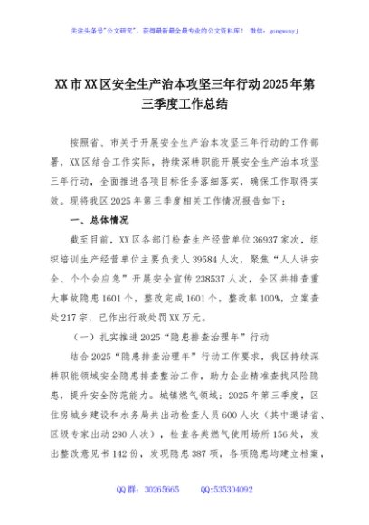 / XX市XX区安全生产治本攻坚三年行动2025年第三季度工作总结
