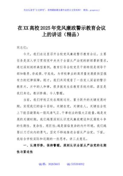 / 在XX高校2025年党风廉政警示教育会议上的讲话(精品)