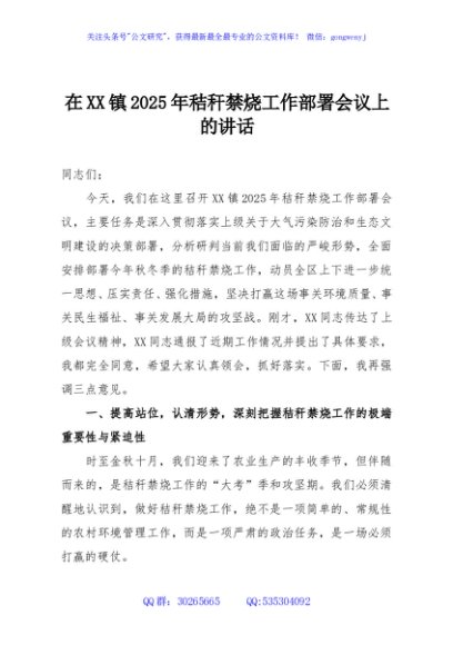 / 在XX镇2025年秸秆禁烧工作部署会议上的讲话