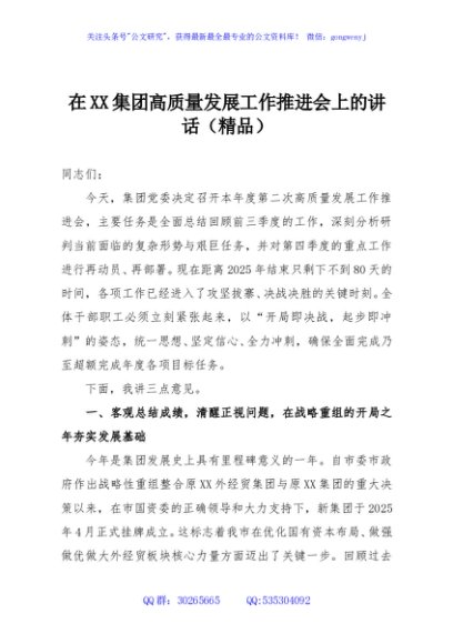 / 在XX集团高质量发展工作推进会上的讲话(精品)
