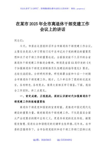 / 在某市2025年全市离退休干部党建工作会议上的讲话