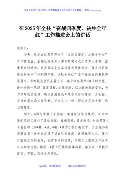 / 在2025年全县“奋战四季度、决胜全年红”工作推进会上的讲话