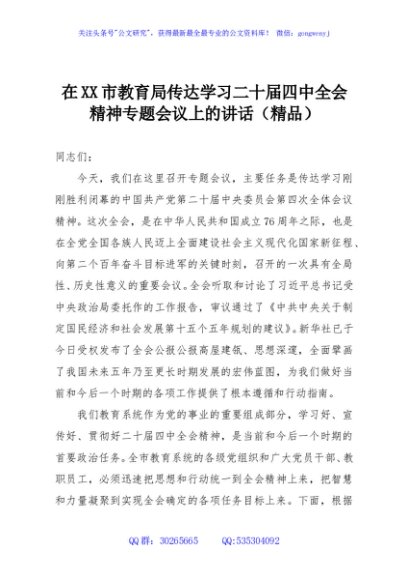 / 在XX市教育局传达学习二十届四中全会精神专题会议上的讲话(精品)