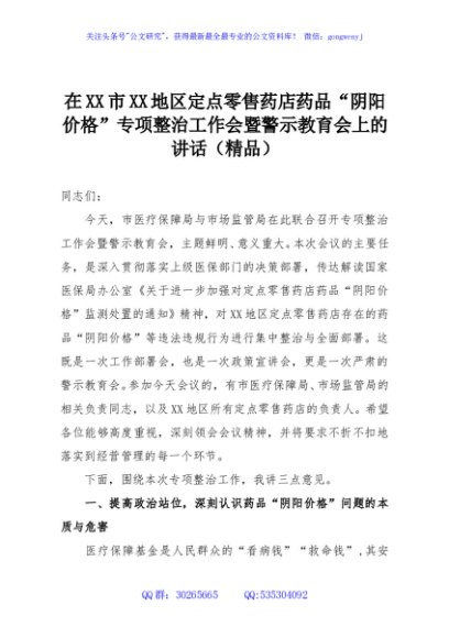 / 在XX市XX地区定点零售药店药品“阴阳价格”专项整治工作会暨警示教育会上的讲话(精品)
