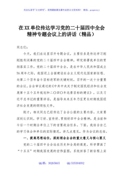 / 在XX单位传达学习党的二十届四中全会精神专题会议上的讲话(精品)