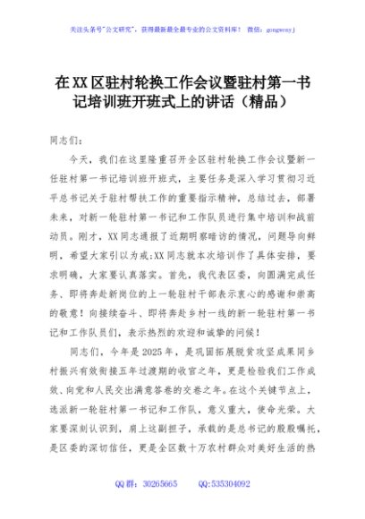 / 在XX区驻村轮换工作会议暨驻村第一书记培训班开班式上的讲话(精品)