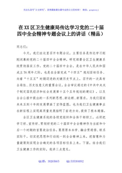 / 在XX区卫生健康局传达学习党的二十届四中全会精神专题会议上的讲话(精品)