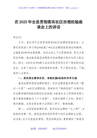 / 在2025年全县贯彻落实社区治理经验座谈会上的讲话