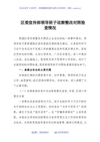 / 区委宣传部领导班子巡察整改对照检查情况