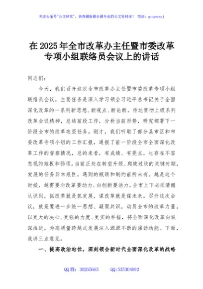 / 在2025年全市改革办主任暨市委改革专项小组联络员会议上的讲话