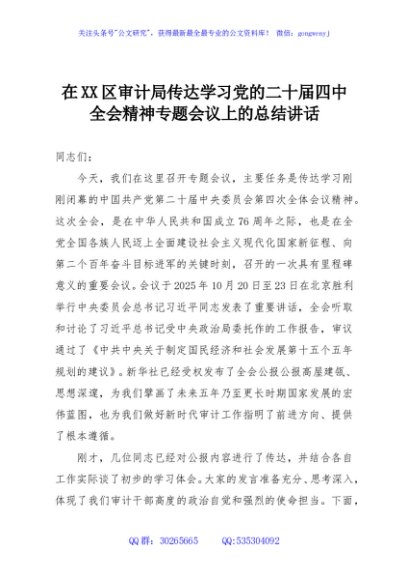 / 在XX区审计局传达学习党的二十届四中全会精神专题会议上的总结讲话