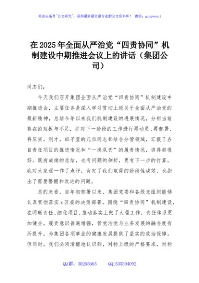 / 在2025年全面从严治党“四责协同”机制建设中期推进会议上的讲话(集团公司)
