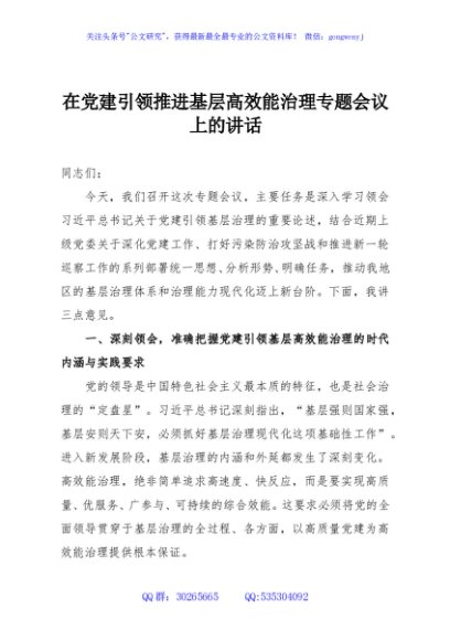 / 在党建引领推进基层高效能治理专题会议上的讲话