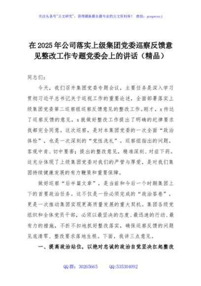 / 在2025年公司落实上级集团党委巡察反馈意见整改工作专题党委会上的讲话(精品)