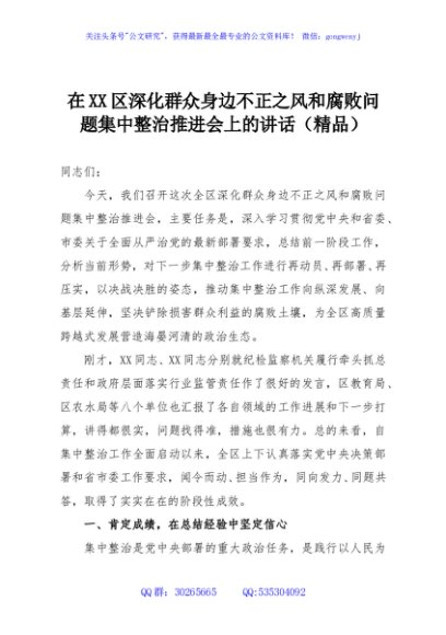 / 在XX区深化群众身边不正之风和腐败问题集中整治推进会上的讲话(精品)