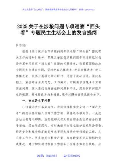 / 2025关于在涉粮问题专项巡察“回头看”专题民主生活会上的发言提纲