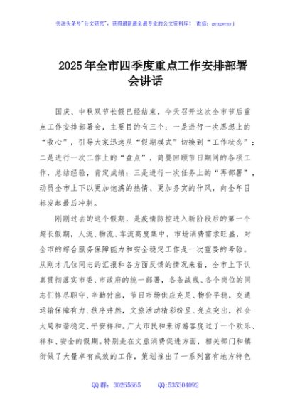/ 2025年全市四季度重点工作安排部署会讲话