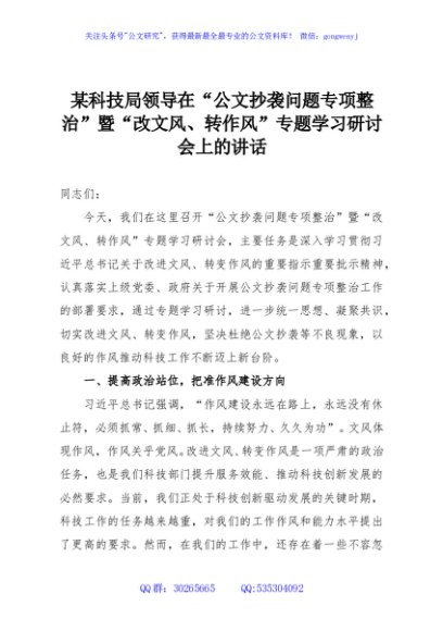 / 某科技局领导在“公文抄袭问题专项整治”暨“改文风、转作风”专题学习研讨会上的讲话